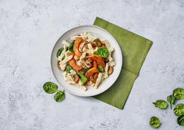 Nachdem du unsere Pasta mit gebackenen Pilzen und Kürbis probiert hast, wirst du Kürbis in all deinen Rezepten verwenden wollen! Während die Pilze einen herzhaften Geschmack verleihen, sorgt der Kürbis für ein wenig Süße - vor allem, wenn die Ränder im Ofen leicht karamellisiert werden - und schafft so eine harmonische Kombination aus herzhaft und süß, die durch den Spinat ausgeglichen wird.