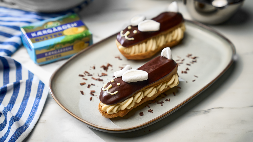 Tipp 2: Ein Eclair als kleiner Osterhase. Glasiere deine Eclairs mit weißer Schokolade und male mit flüssiger dunkler Schokolade ein Hasengesicht auf. Für die Ohren schneide mit einer Küchenschere Scheiben von einem Marshmallow ab und setze sie auf das Eclair. Für den Bommelschwanz halbiere eine dieser Scheiben erneute und setze sie ebenfalls auf das Eclair.