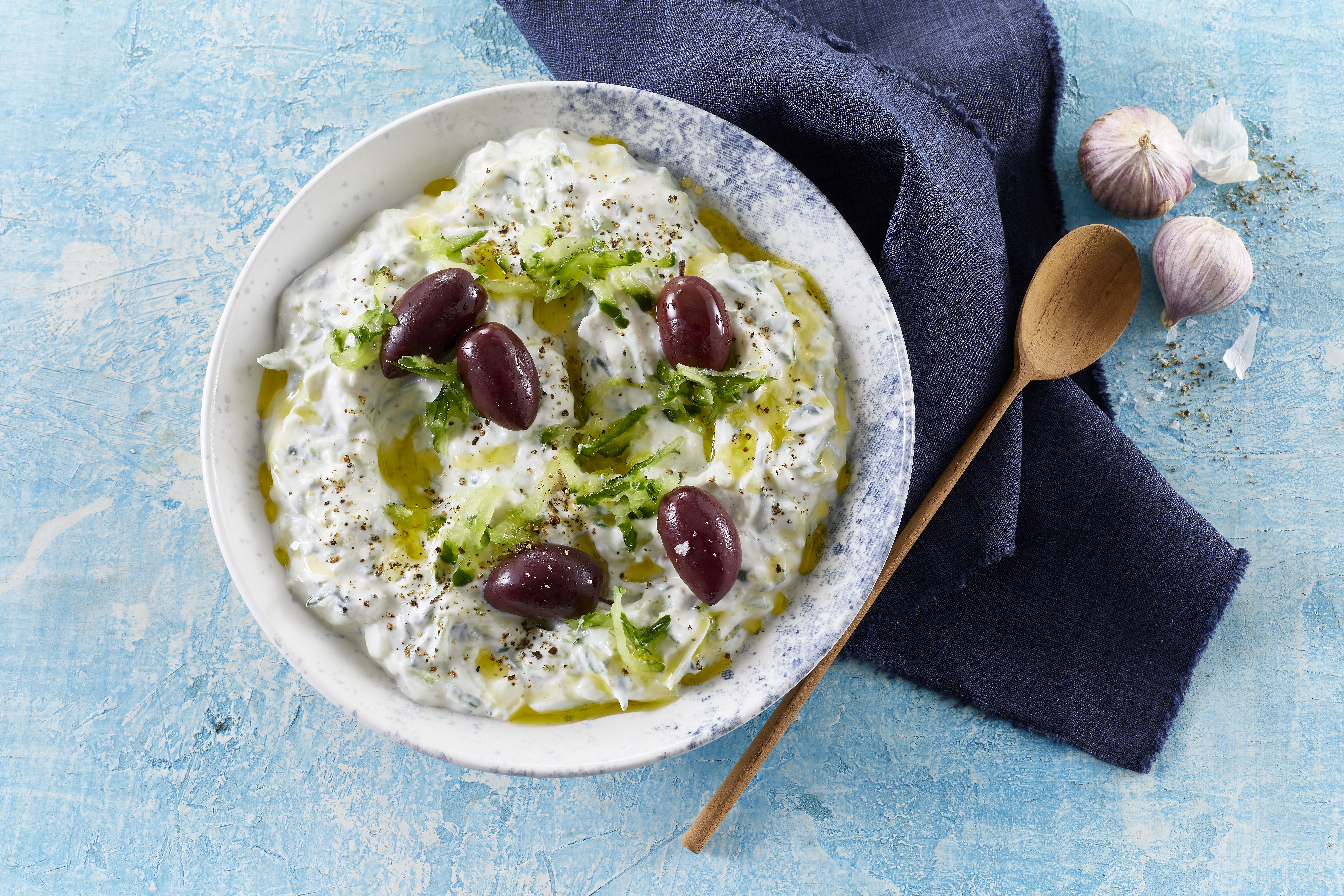 Eine klassische Verwendung von griechischem Joghurt ist die Zubereitung von Tzatziki. Der traditionelle griechische Dip kombiniert griechischen Joghurt mit geriebener Gurke, Knoblauch, Zitronensaft und Dill. Er passt wunderbar zu gegrilltem Fleisch und Gemüse, kann aber auch als Gewürz serviert werden, z. B. zu Brot. Aber mit Tzatziki ist die Party noch lange nicht zu Ende. Generell ist griechischer Joghurt eine gute Wahl für Dressings, Dips und Aufstriche. Du kannst ihn mit Kräutern, Gewürzen oder gebratenem Gemüse mischen und so Beilagen für jede Mahlzeit kreieren.