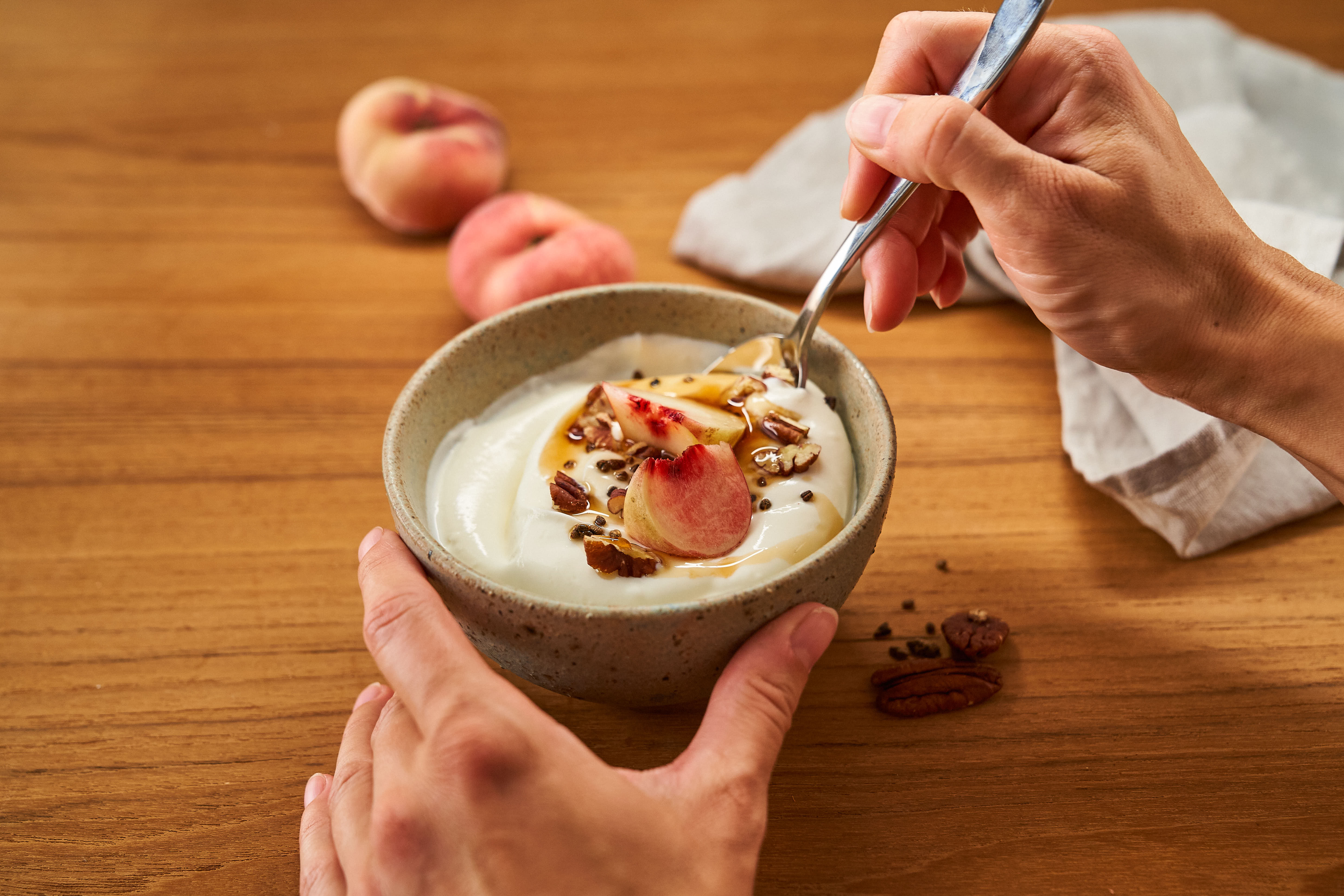 Pfirsich, Pekannuss und Kardamom als Belag für Skyr