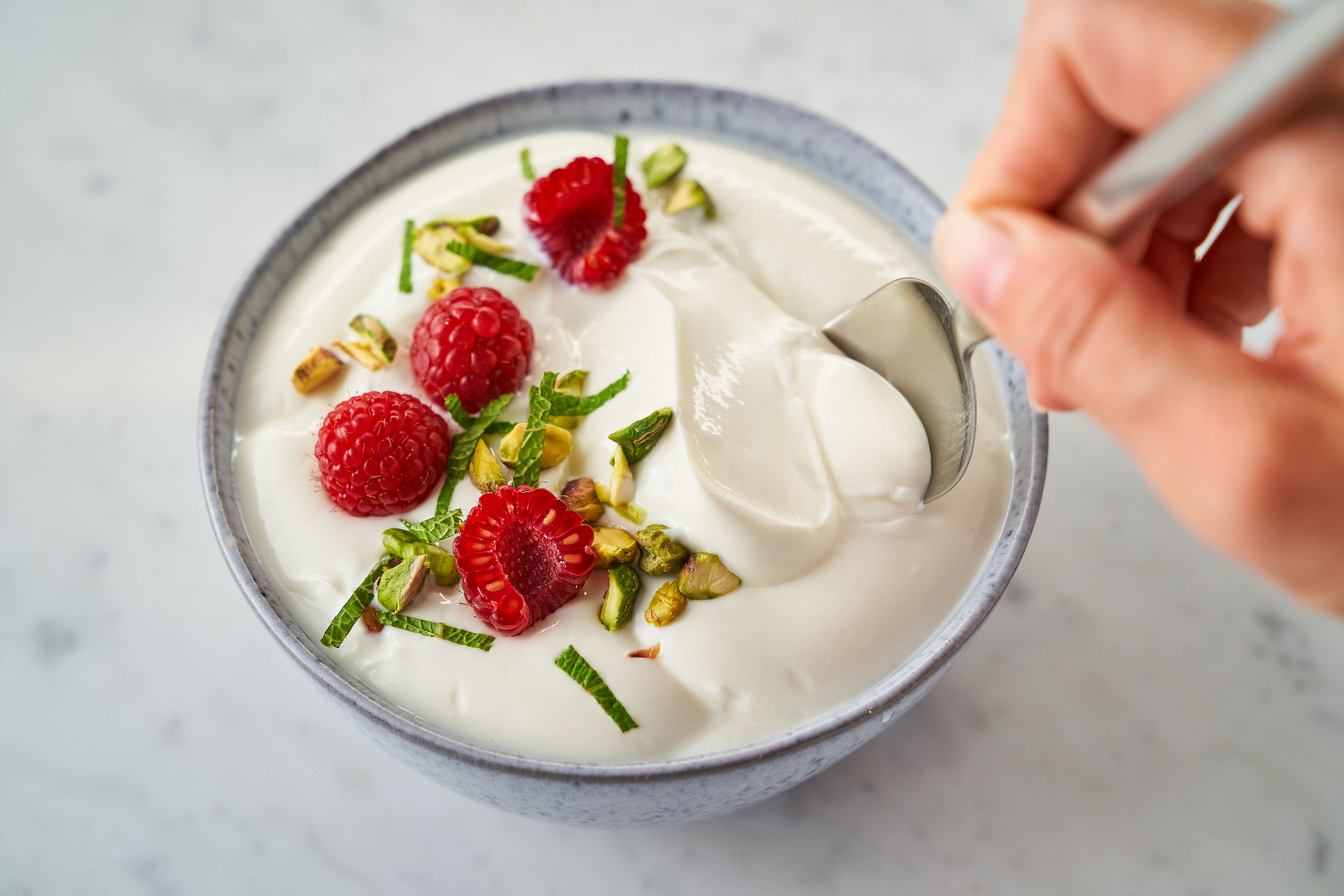Verwende frisches Obst und Beeren zu Skyr, um eine Vielzahl von Geschmacksrichtungen zu erhalten - von Mango bis zu Beeren.