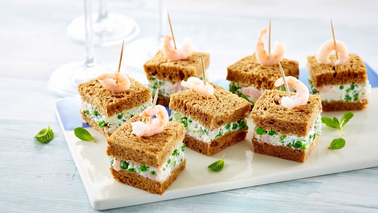 Wenn du gerne viele kleinere Gerichte als eine Art Picknick-Tapas servieren möchtest, sind kleine Picknick-Sandwiches eine großartige Ergänzung. Finger-Sandwiches sind genauso lecker wie ihre größeren Verwandten und noch einfacher zu essen. Das macht sie zu einem großartigen Picknick-Essen. Und dazu kommt noch ihr köstlicher Geschmack! Unsere Version bietet köstliche Garnelen, knackige Gurken, erdige Erbsen und süße Minze. Diese Kombination sorgt für ein erfrischendes kulinarisches Erlebnis mit vielen großartigen, aber dennoch feinen Aromen.