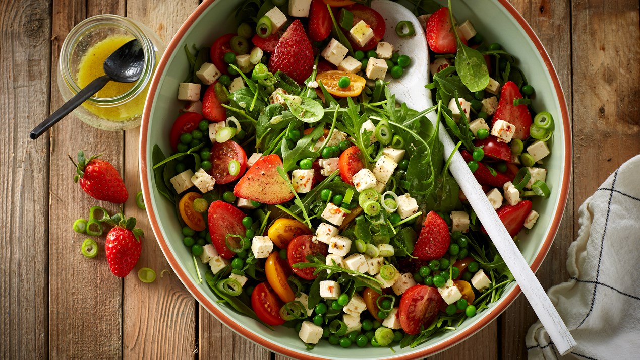 Probiere einen köstlichen Sommersalat mit Erdbeeren Erdbeeren sind nicht nur etwas für Desserts. Die beliebten Beeren werden zwar meist mit süßen Gerichten in Verbindung gebracht – man denke an Marmeladen, Torten, Eis und Smoothies –, aber sie sind auch eine fantastische Ergänzung für sommerliche Salatrezepte. Die leuchtend rote Farbe der Erdbeeren macht jedes Gericht noch attraktiver und verführerischer. Ihr süßer, leicht säuerlicher Geschmack passt zu einer Vielzahl von Zutaten, von bitterem Gemüse und würzigem Käse bis hin zu erdigen Nüssen und herzhaften Körnern. Das macht sie zu einer beliebten Zutat für viele Sommersalatrezepte. Immer noch skeptisch? Dann probiere unsere folgenden Rezepte aus – sie werden dich sicherlich überzeugen.
