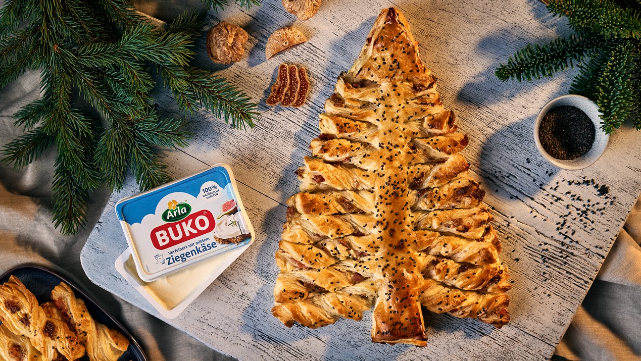 Herzhaft, knusprig, köstlich. Dieser besondere Weihnachtsbaum hat’s in sich. Und noch schöner: Die Zubereitung für diesen Festtagsschmaus ist überraschend einfach. Für die Füllung des Blätterteig-Weihnachtsbaums kommen allerlei winterliche Aromen zusammen, wie Rosmarin, Pinienkerne, knuspriger Speck und getrocknete Feigen. Der Blätterteig wird großzügig mit mildem Ziegenkäse bestrichen und mit der Füllung belegt. Vor dem Backen schneidest du den Blätterteig in die Form eines Tannenbaums, wodurch er nicht nur geschmacklich, sondern auch optisch zum Highlight wird. Mit einer Glasur aus Eigelb und Schwarzkümmel verfeinert, wandert das Bäumchen in den Ofen. Dort verwandelt er sich in eine goldbraune Köstlichkeit mit herrlich knuspriger Textur. Serviere den Blätterteig-Weihnachtsbaum noch warm, deine Gäste werden staunen.