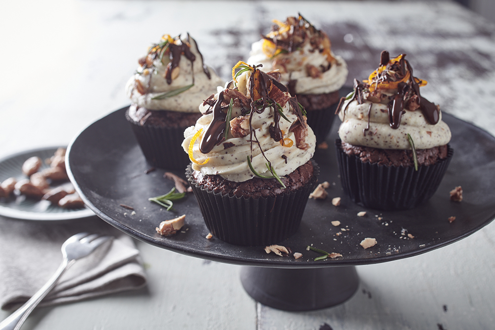 Zelebriere die gemütliche Atmosphäre der Feiertage mit unseren unwiderstehlichen Schokoladen-Cupcakes, deren verlockende Basis ein leckerer Schokoladen-Teig ist. Das Herzstück dieser köstlichen Leckerei ist aber zweifellos das grandiose Topping, das den Winter sowohl geschmacklich als auch optisch einfängt. Dabei wird aus Butter, Mohnpaste und sahnigem Frischkäse eine unwiderstehliche cremige Haube gezaubert und den Cupcakes als Krone aufgesetzt. Als Deko obendrauf dürfen typische Winter-Stars wie gemahlener Zimt, grob gebrannte Mandeln, Orangenzesten und Schokoladenraspeln selbstverständlich nicht fehlen. Grüne Rosmarinzweige sorgen dazu für einen Hauch von Frische und verleihen jedem Cupcake eine festliche Eleganz, die perfekt in die Weihnachtszeit passt.
