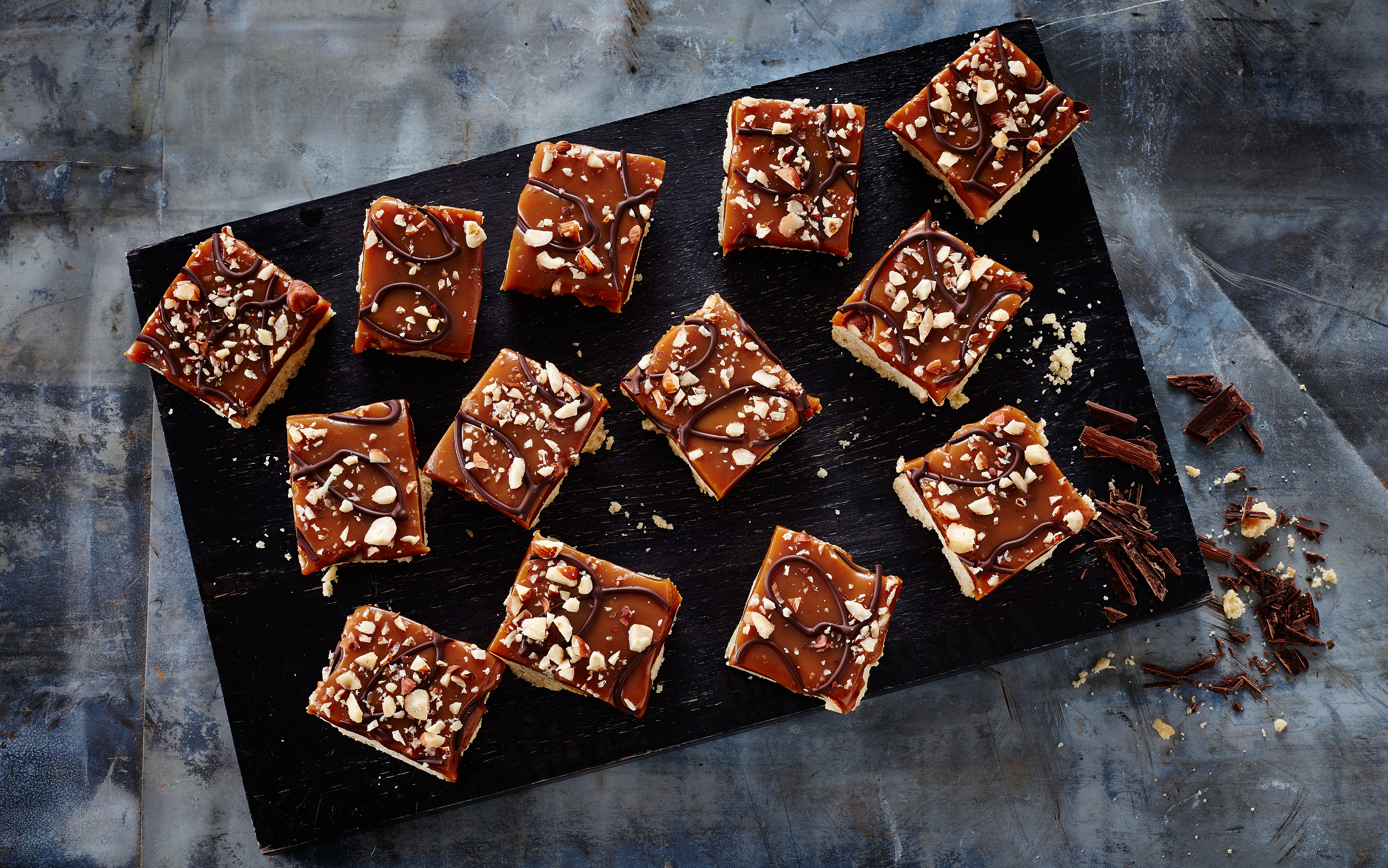 Mit diesem raffinierten Rezept für die Festtage wird euer Weihnachten noch schöner und vor allem süßer! Unsere Karamell-Schnitten sind mehr als Weihnachtsplätzchen, sie sind eine wahre Symphonie aus knusprigem Mürbeteig, seidigem Karamell und schmelzender Schokolade. Die Magie beginnt mit einem golden gebackenen Mürbeteigboden, gefolgt von einer göttlichen Karamellmasse, die mit Butter, Zucker, Sirup und Kondensmilch angerührt und gekocht wird, Damit deine Karamell-Schnitten nicht nur geschmacklich, sondern auch optisch perfekt zur Weihnachtsdeko passen, verleihst du ihnen den letzten Schliff mit schönen, kreativen Mustern aus geschmolzener Schokolade. Und als krönender Abschluss gesellen sich knusprige Haselnüsse als Topping dazu – einfach himmlisch!