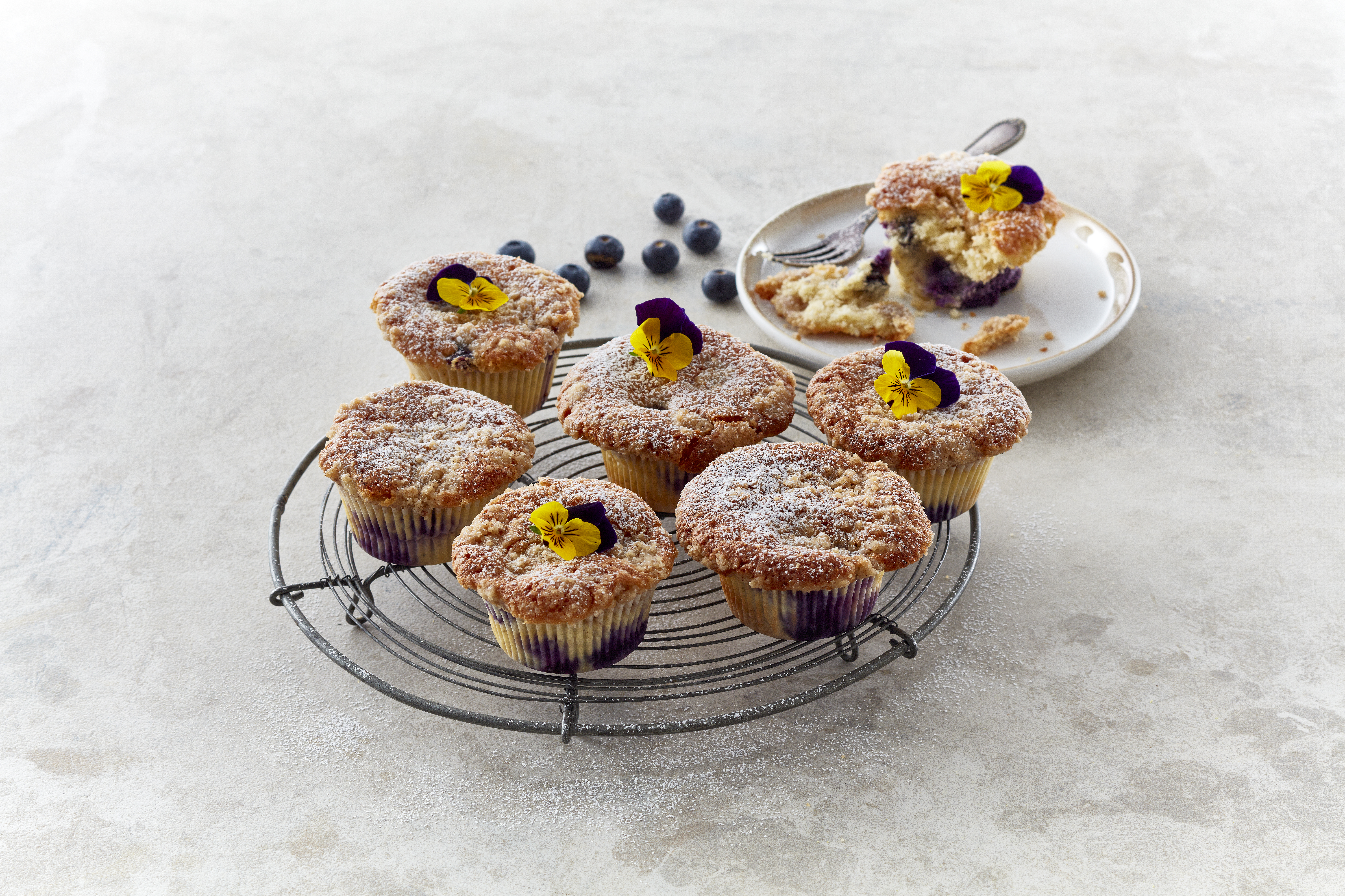 Unsere Blaubeer-Käsekuchen-Muffins kombinieren den süßen, nussigen Geschmack von Marzipan mit saftigen Heidelbeeren und einer cremigen Käsekuchenfüllung. Mit butterartigen Streuseln belegt und mit gesiebtem Puderzucker und essbaren Blüten garniert, sind sie eine optisch ansprechende und geschmacksintensive Leckerei für jedes Osterfest.