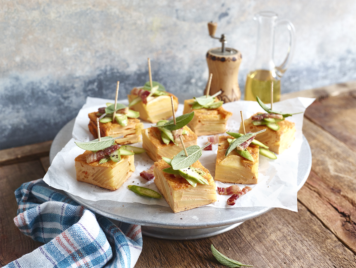 Kartoffelkuchen mit Speck, Salbei und grünem Spargel