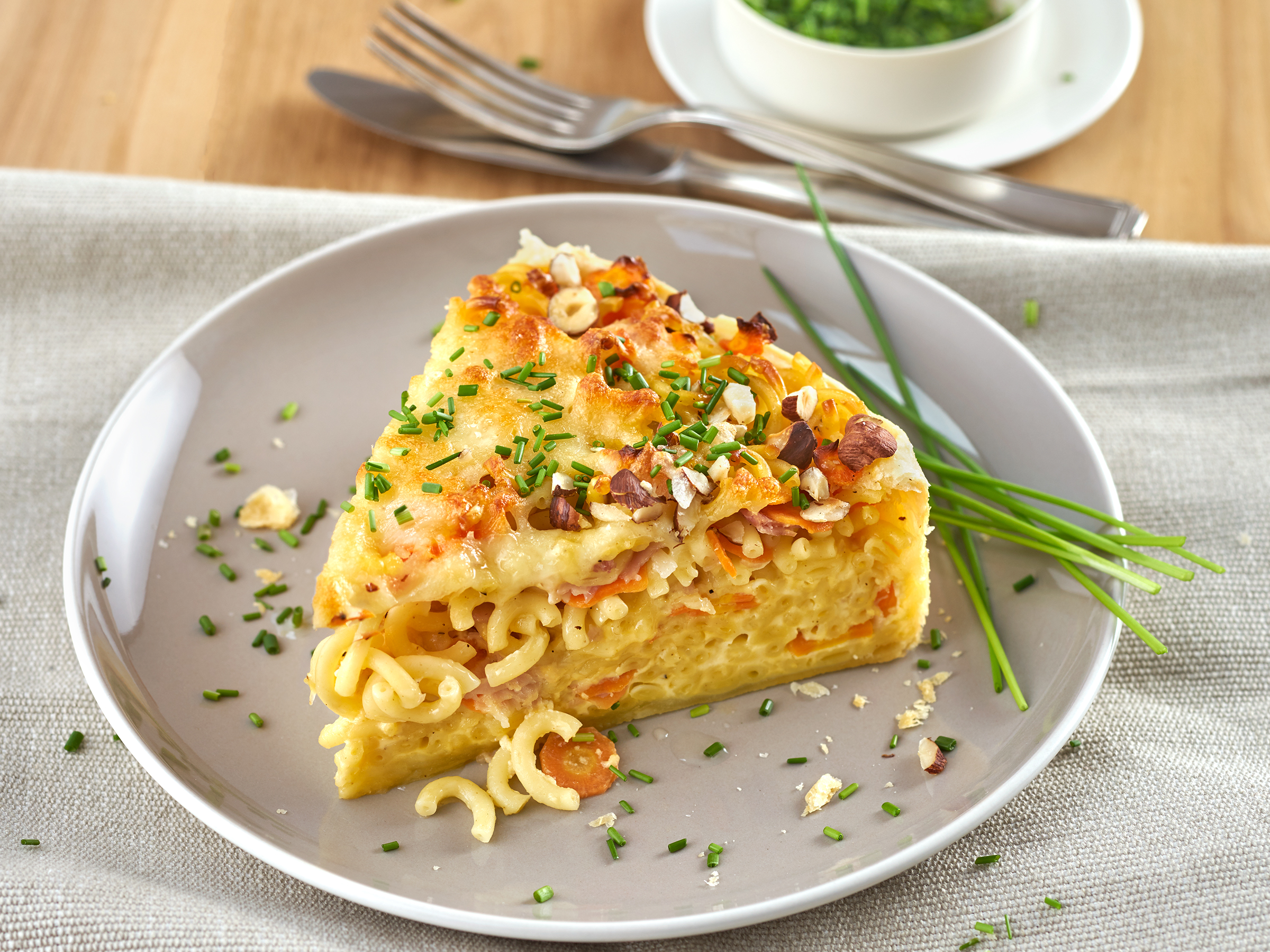 Gabelspaghetti Quiche mit Möhren und Haselnüssen