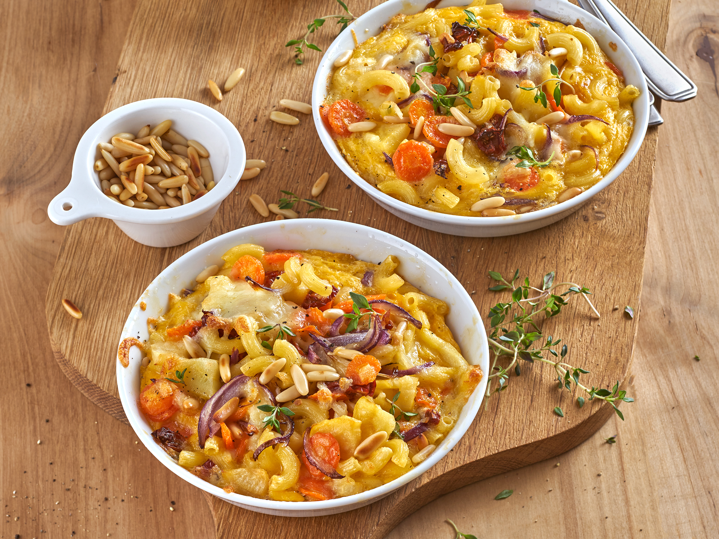 Nudelfrittata mit Wurzelgemüse, getrockneten Tomaten und Pinienkernen