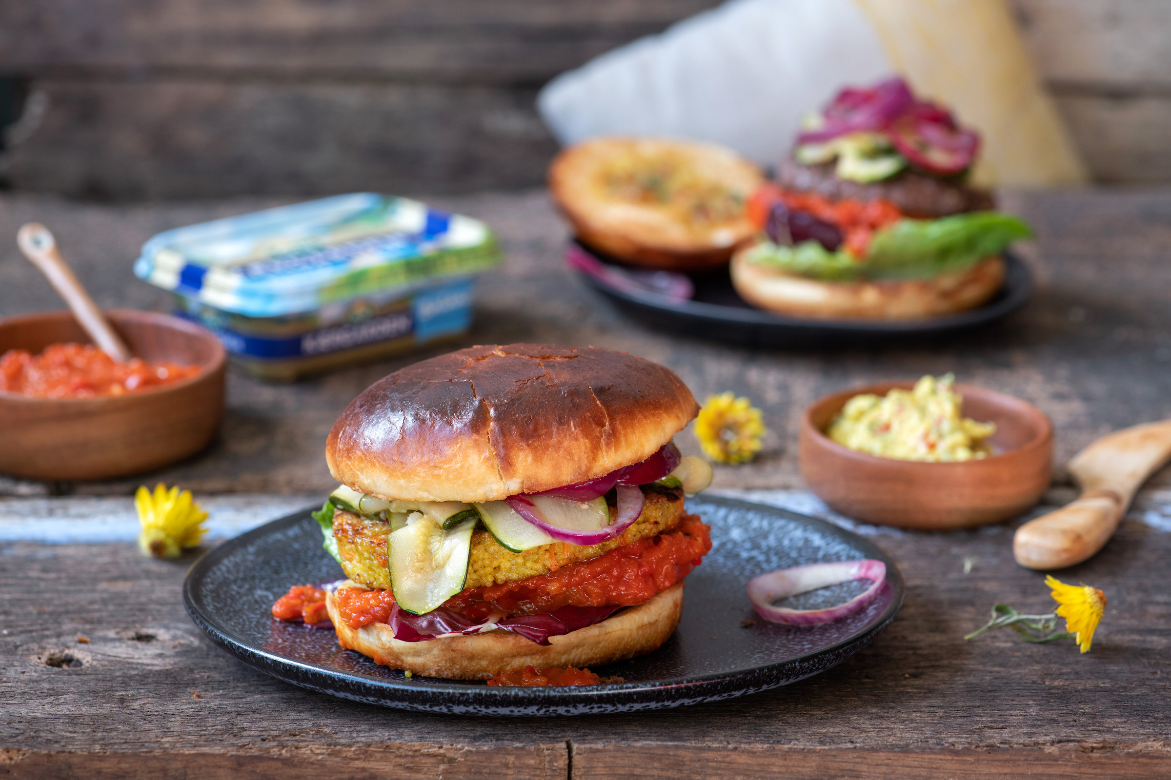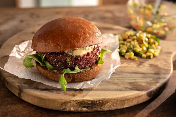 Burger aus Roter Bete, Quinoa und schwarzen Bohnen mit Chipotle-Butter und Mais-Salsa