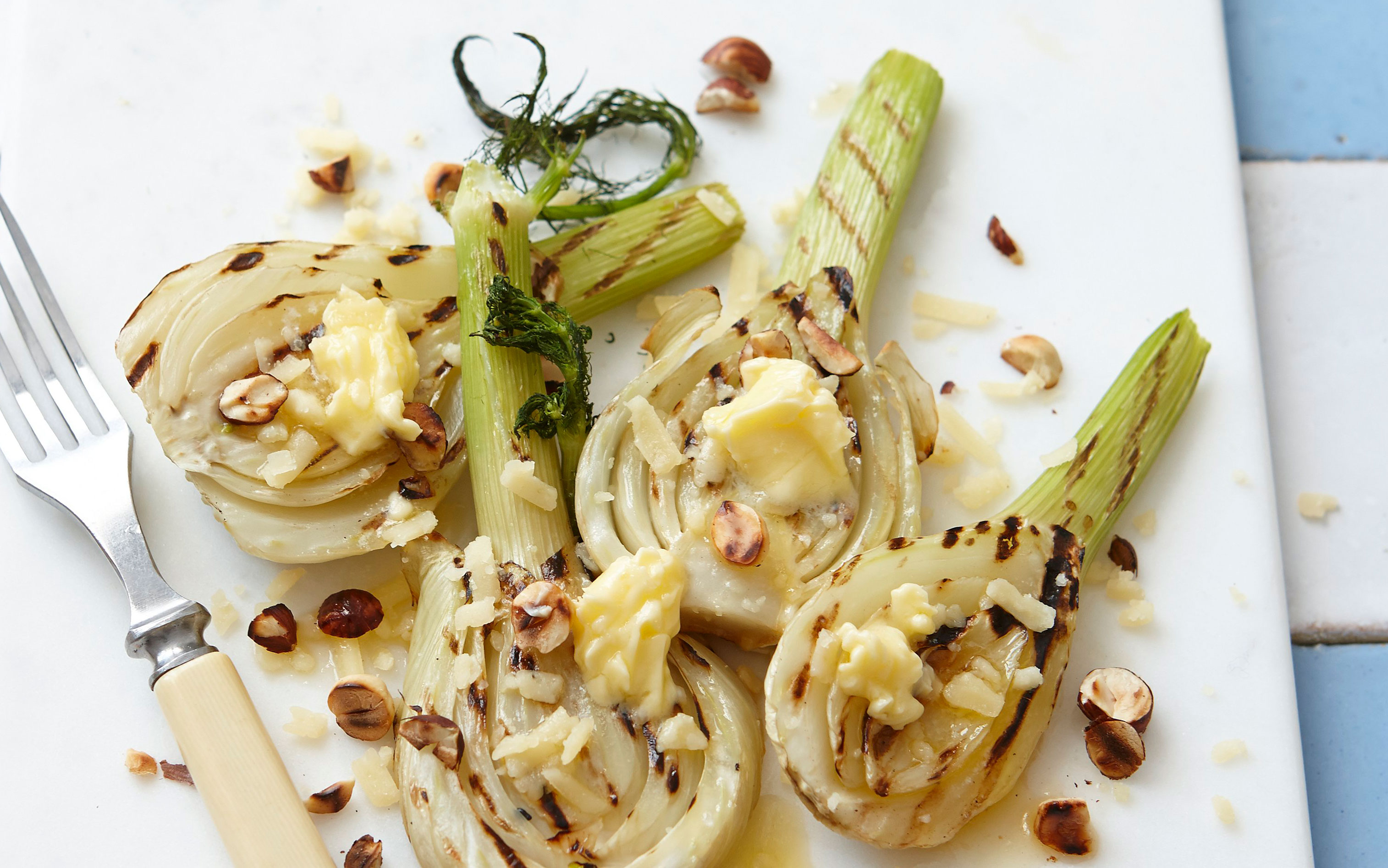 Gegrillter Fenchel mit Butter, Reibekäse und Nüssen